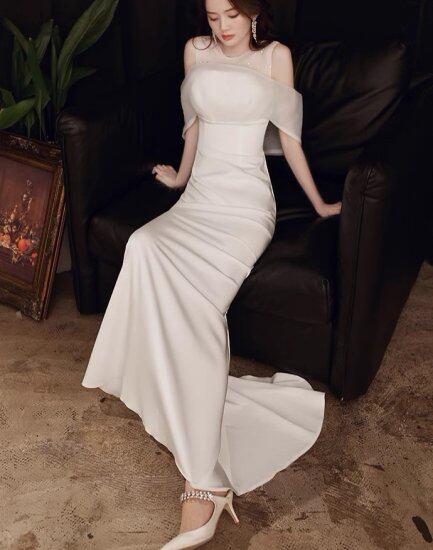 演奏会ドレス レディース 結婚式ドレス ロングドレス ショール ノースリーブ 透け感 ビジュー フィッシュテール ビーズ ウェディングドレス パーティードレス エレガント スリム イブニングドレス