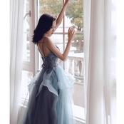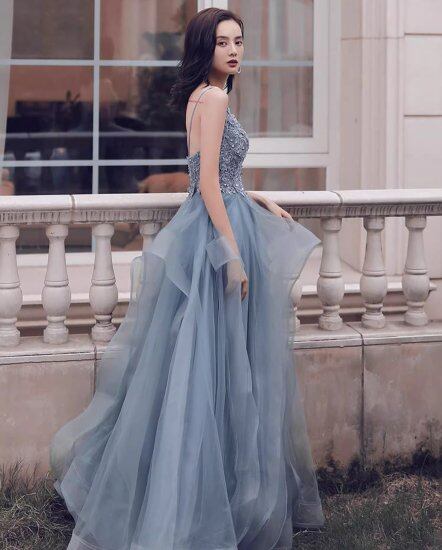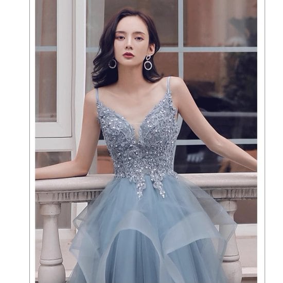 演奏会ドレス レディース 結婚式ドレス Vネック チュールレース ロング丈 キャミソールドレス パーティードレス カラードレス イブニングドレス 披露宴 ステージ衣装 エレガント 華やか ブルー
