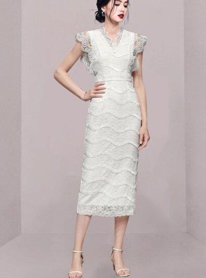 結婚式ドレス レディース レース Vネック ミモレ丈 ロング丈 レースワンピース 演奏会 発表会 謝恩会 二次会 結婚式 ノースリーブ 総レース エレガント 上品 白 ホワイト ウェディング