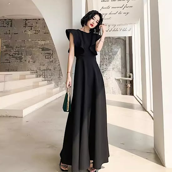 結婚式ドレス ラウンドネック フリル ロング丈 ハイウエスト 発表会 演奏会 レディース 結婚式 ステージ衣装 エレガント ウエディングドレス カラードレス イブニングドレス パフォーマンス
