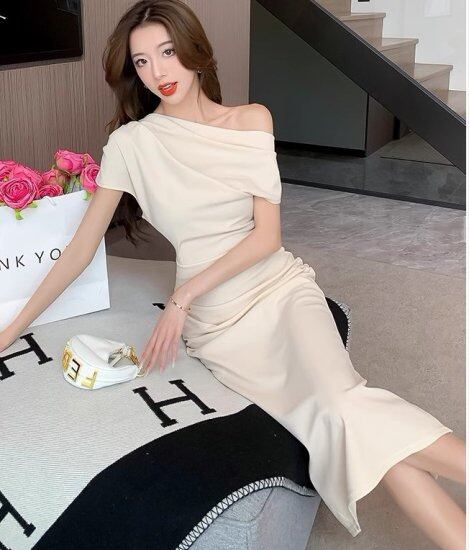結婚式ドレス レディース オフショルダー ワンショルダー タイトワンピース スリム ロングワンピース 半袖 無地 ミモレ丈 演奏会 発表会 披露宴 パーティードレス エレガント ロングドレス