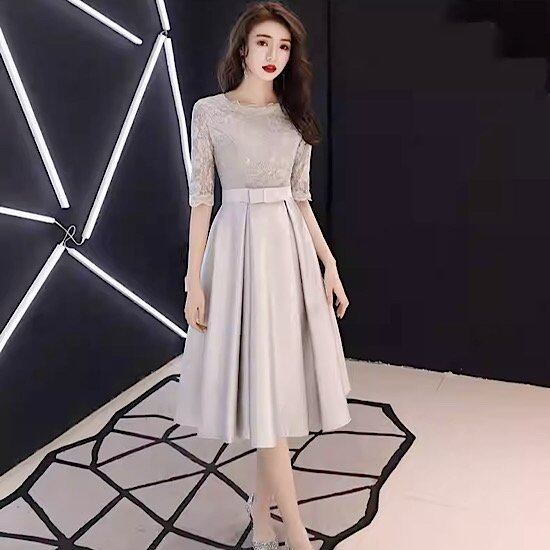 結婚式ドレス ラウンドネック 無地 ミモレ丈 ハイウエスト 発表会 演奏会 レディース 結婚式 ステージ衣装 エレガント カラードレス イブニングドレス 五分袖 フレアスカート 煌めき