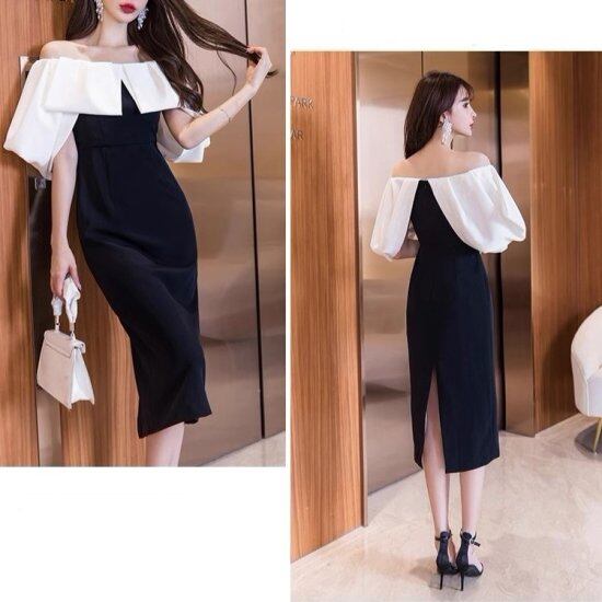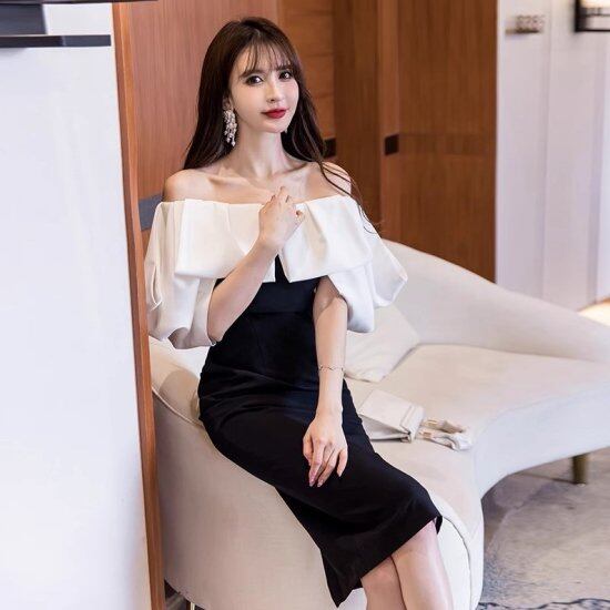 結婚式ドレス レディース オフショルダー バイカラー 配色 フリル タイトワンピース ミモレ丈 ロング丈 演奏会 発表会 披露宴 謝恩会 パーティードレス イブニングドレス エレガント