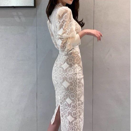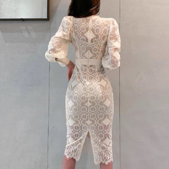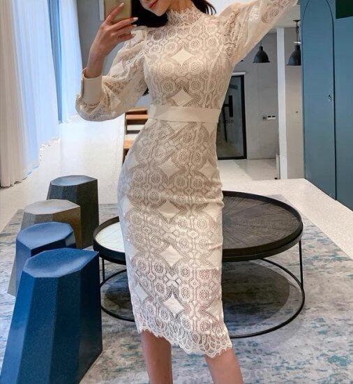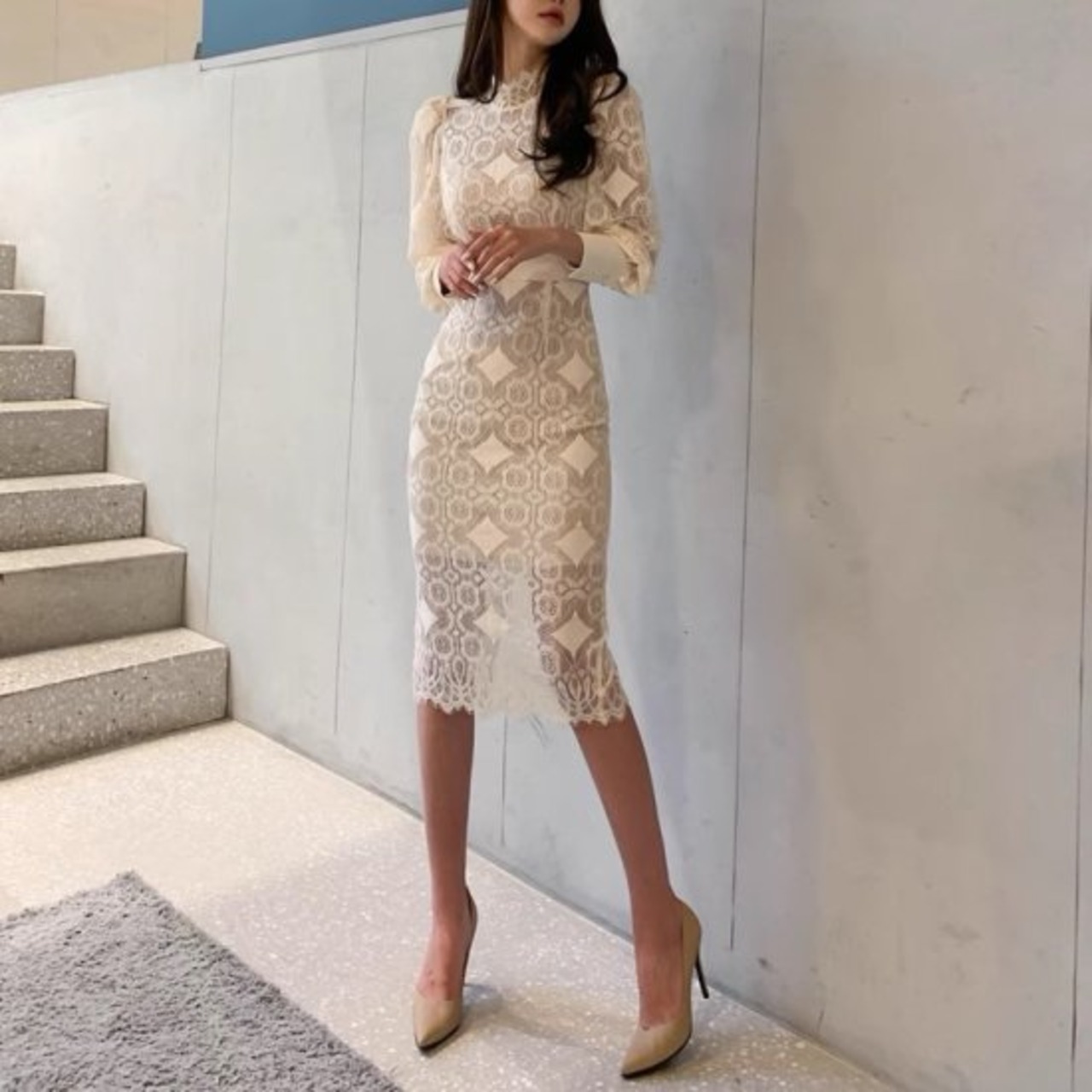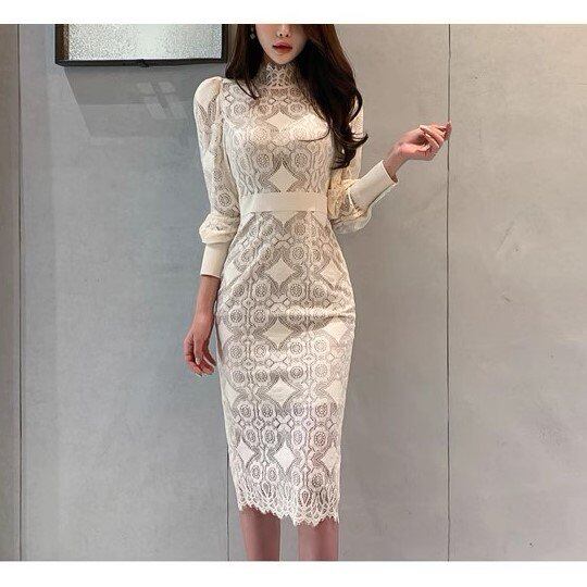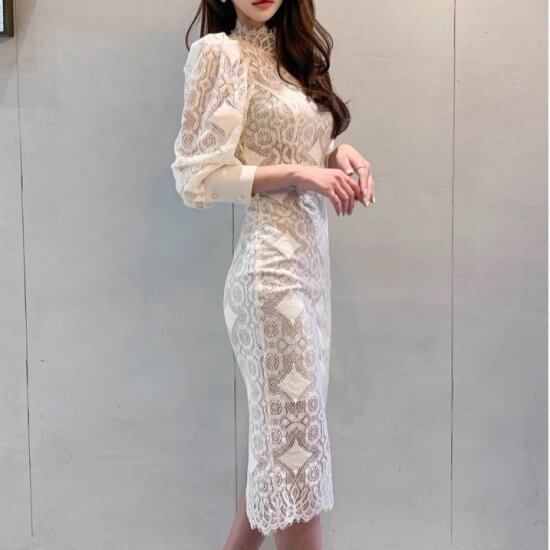 結婚式ドレス レディース レース 長袖 総レース タイトワンピース ハイネック パフスリーブ ハイウエスト 透け感 シアー シースルー 演奏会 披露宴 パーティードレス エレガント 華やか