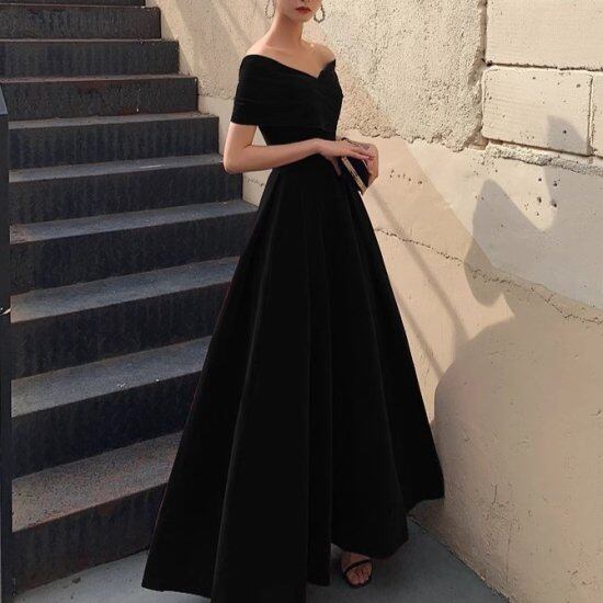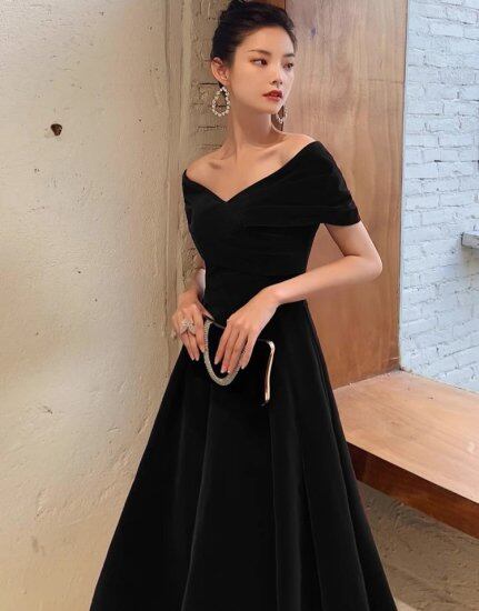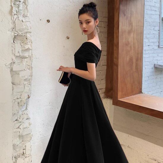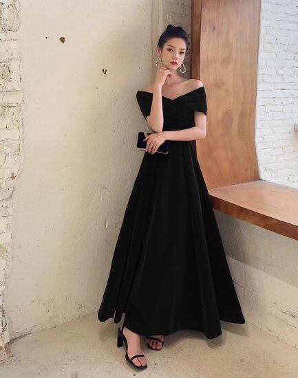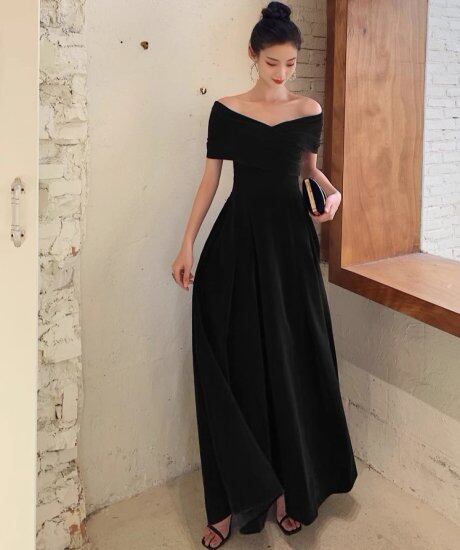 演奏会ドレス レディース オフショルダー ベルベット Aライン ロング丈 マキシ丈 フレア 半袖 無地 黒 ブラック 結婚式 発表会 ステージ衣装 パーティードレス イブニングドレス エレガント