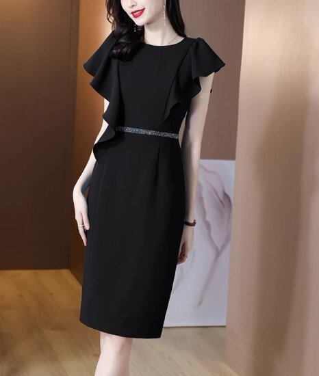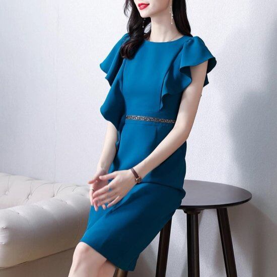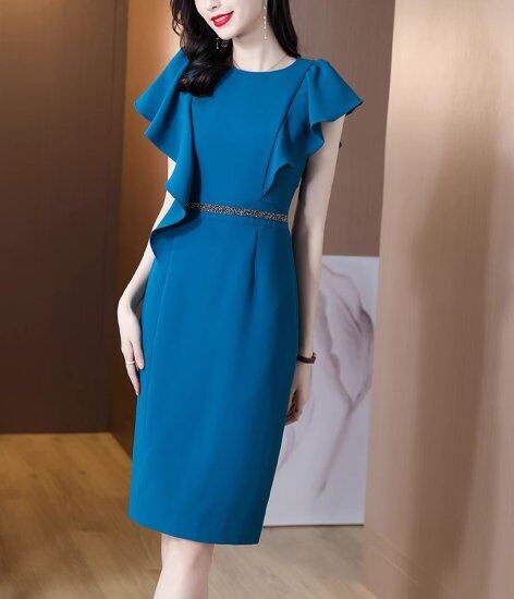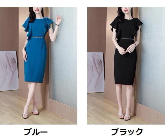結婚式ドレス レディース タイトワンピース フリル ラウンドネック ミディアム丈 ミモレ丈 ひざ丈 アシンメトリー フリル袖 半袖 演奏会 発表会 披露宴 二次会 パーティー きれいめ エレガント