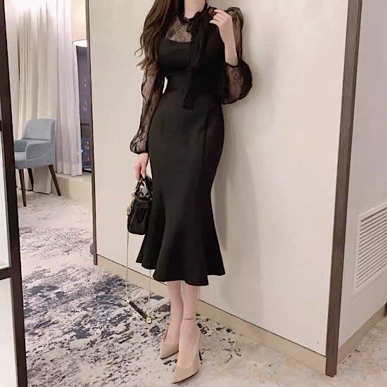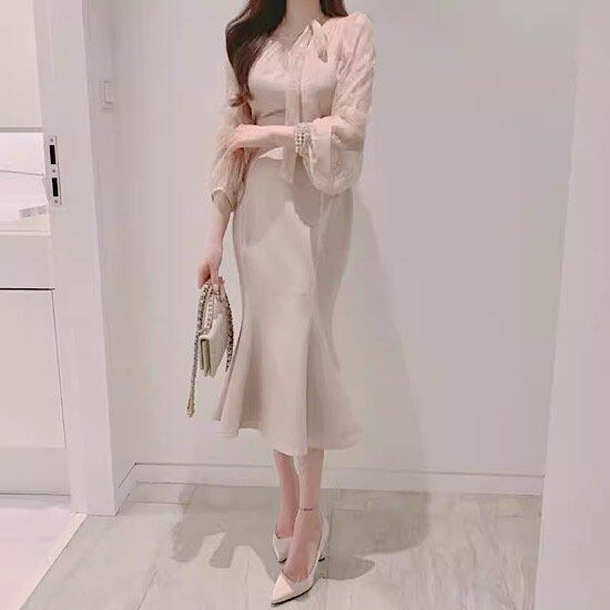 結婚式ドレス レース タイ付き スリムフィット 無地 シンプル 長袖 ミモレ丈 発表会 演奏会 レディース 結婚式 ステージ衣装 エレガント ウエディングドレス カラードレス イブニングドレス