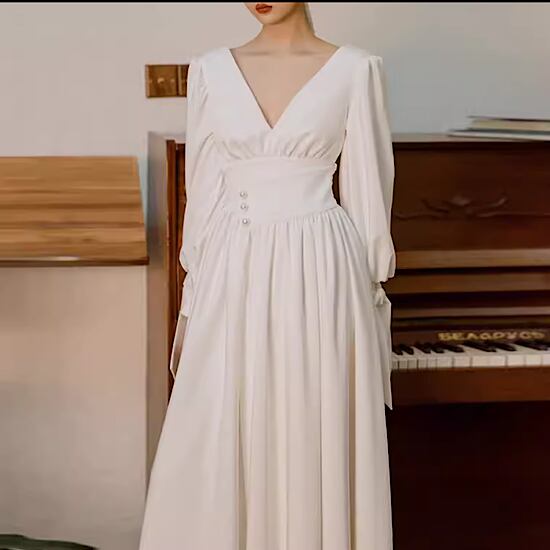 結婚式ドレス フレンチ 長袖 ウエストマーク ロング丈 無地 シンプル ハイウエスト 発表会 演奏会 レディース 結婚式 ステージ衣装 エレガント ウエディングドレス カラードレス イブニングドレス