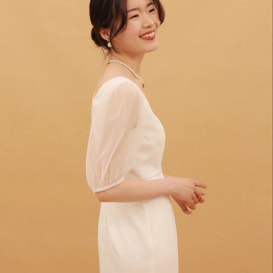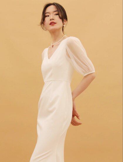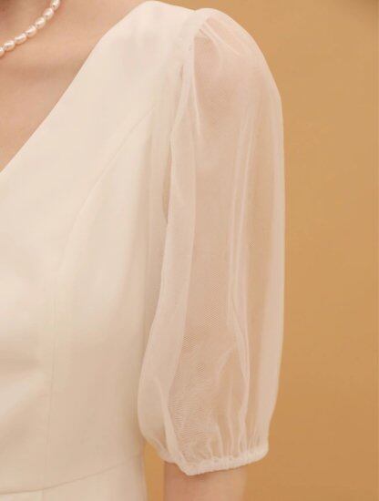 演奏会ドレス レディース ウェディングドレス Vネック パフスリーブ シアースリーブ 透け感 シースルー スリム マーメイド ロング丈 マキシ 結婚式 二次会 発表会 パーティードレス エレガント