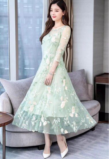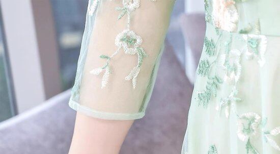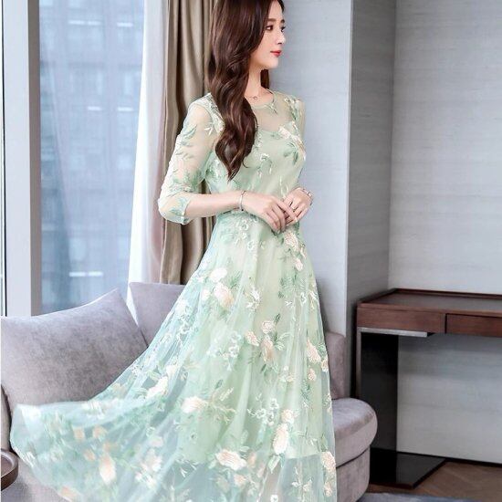 結婚式ドレス レディース 花柄 刺繍 レース シースルー 透け感 ロングドレス ラウンドネック 七分袖 ロング丈 Aライン 演奏会 二次会 披露宴 ステージ衣装 パーティー 華やか エレガント