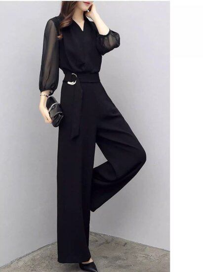 パンツドレス レディース 結婚式ドレス オールインワン Vネック ワイドパンツ 透け感 シアースリーブ 黒 ブラック 披露宴 二次会 謝恩会 パーティードレス パンツスーツ 上品 エレガント