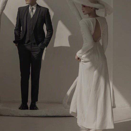 ウェディングドレス レディース 結婚式ドレス 背中あき 長袖 ラウンドネック シンプル 無地 白 ホワイト スレンダー スリム タイト 演奏会 ステージ衣装 パーティードレス 上品 エレガント