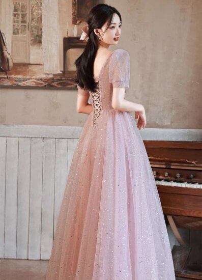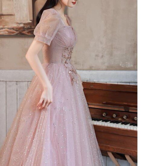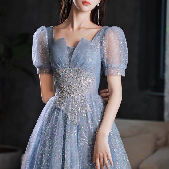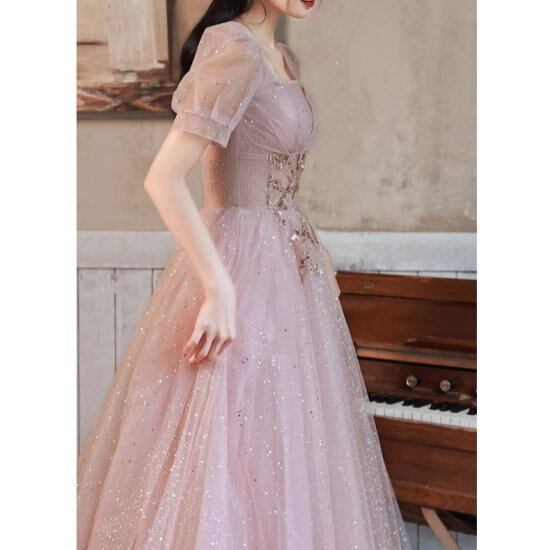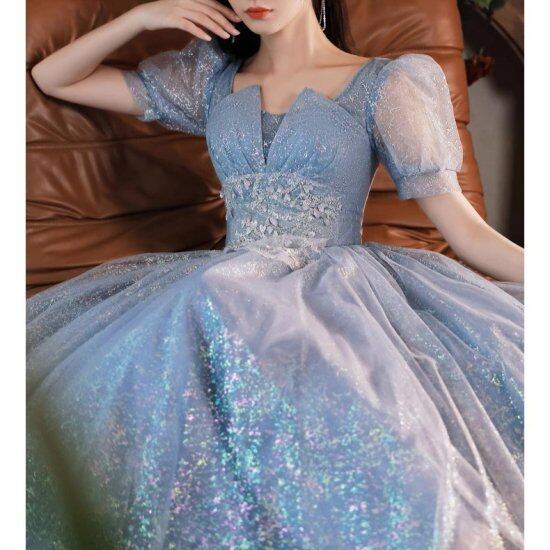 演奏会ドレス レディース ロングドレス パフスリーブ 半袖 ビジュー スクエアネック Vネック ロング丈 マキシ丈 カラードレス 結婚式 ステージ衣装 パーティードレス イブニングドレス エレガント