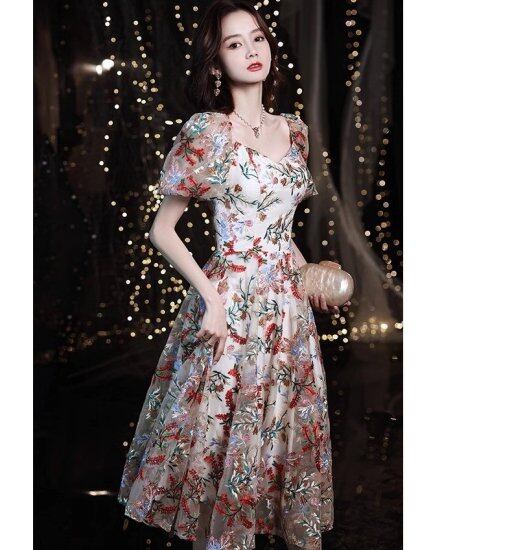 結婚式ドレス レディース 花柄 刺繍 パフスリーブ バルーンスリーブ ハートネック Vネック ミディアム丈 ミモレ丈 演奏会 披露宴 二次会 謝恩会 パーティー イブニングドレス エレガント 華やか