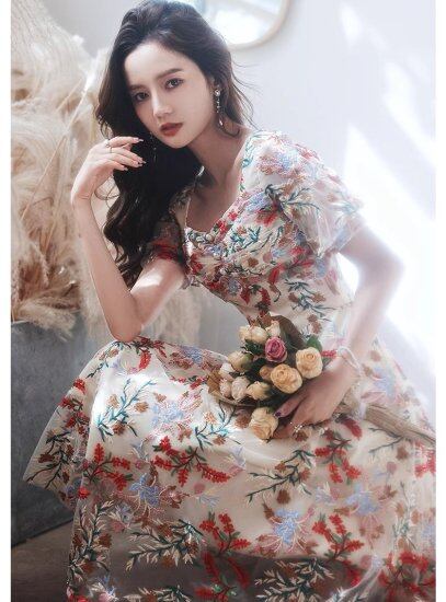 結婚式ドレス レディース 花柄 刺繍 パフスリーブ 半袖 Aライン レース パール ミディアム丈 ミモレ丈 花柄ワンピース 演奏会 二次会 披露宴 謝恩会 パーティードレス 華やか エレガント