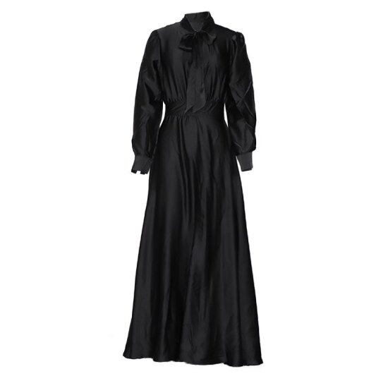 結婚式ドレス レディース ロングワンピース リボン ボウタイ 長袖 パフスリーブ フレアスカート 光沢 マキシ丈 演奏会 二次会 披露宴 謝恩会 パーティードレス ワンピース 華やか エレガント