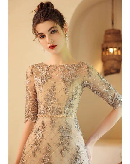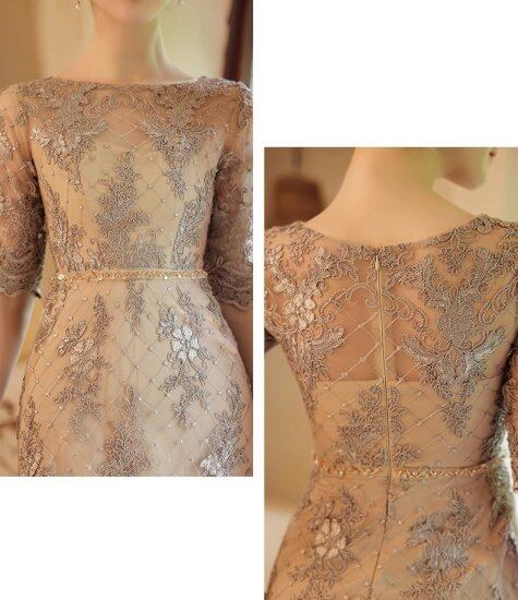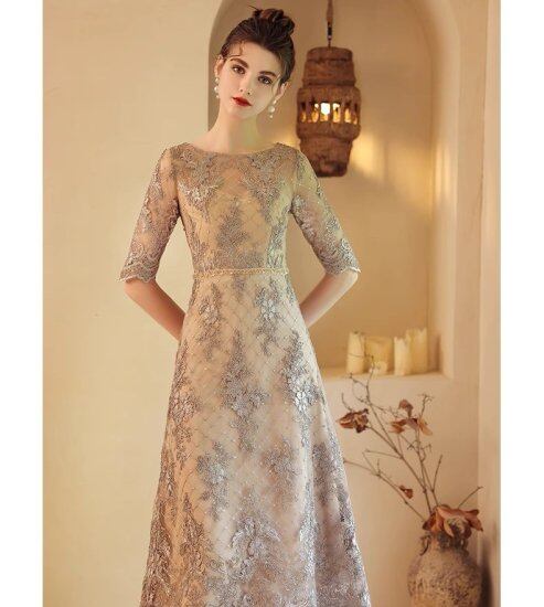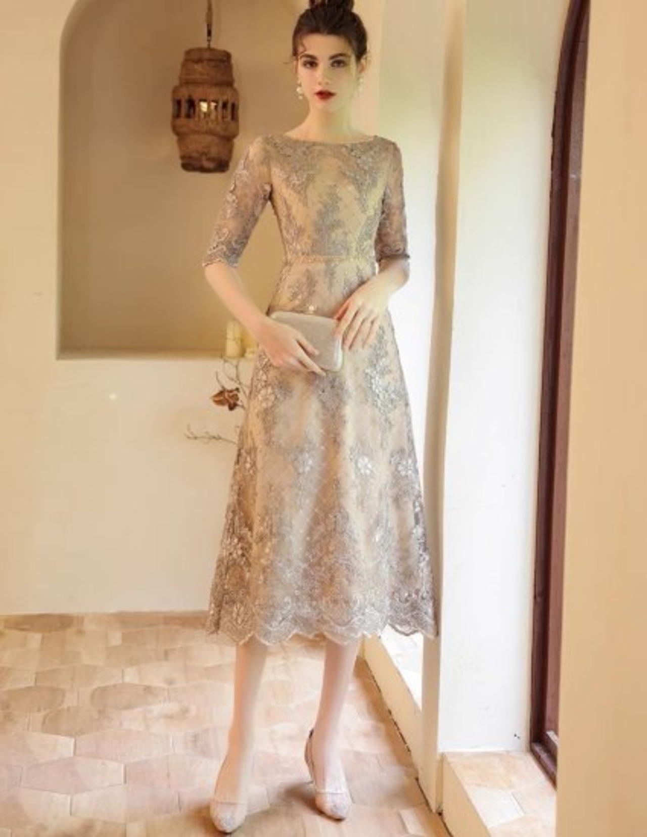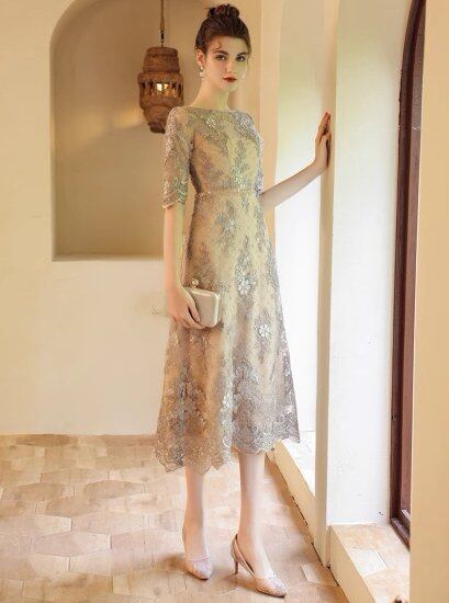 結婚式ドレス レディース 刺繍 レース フレアワンピース 五分袖 半袖 ミモレ丈 ラウンドネック Aライン 透け感 シースルー 演奏会 二次会 披露宴 パーティー イブニングドレス 上品 エレガント