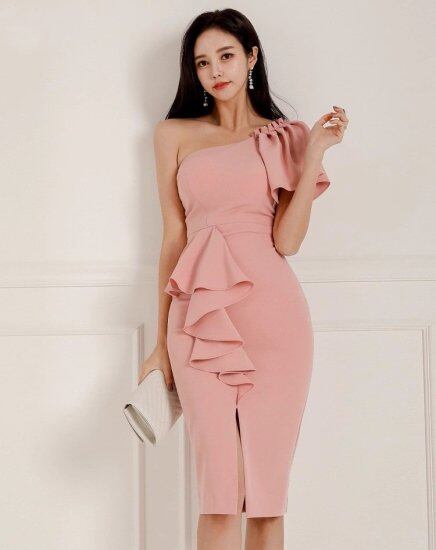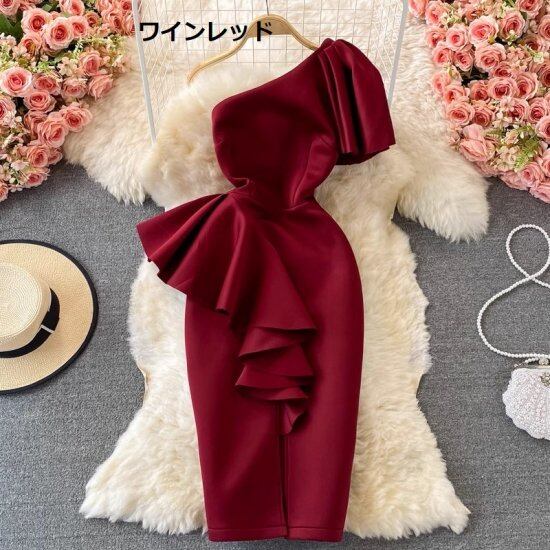 結婚式ドレス レディース ワンショルダー アシンメトリー タイトワンピース フリル スリット スリム ノースリーブ 無地 二次会 謝恩会 ステージ衣装 パーティードレス セクシー エレガント
