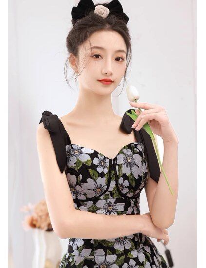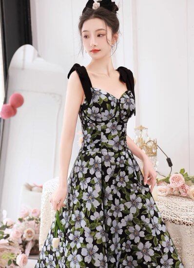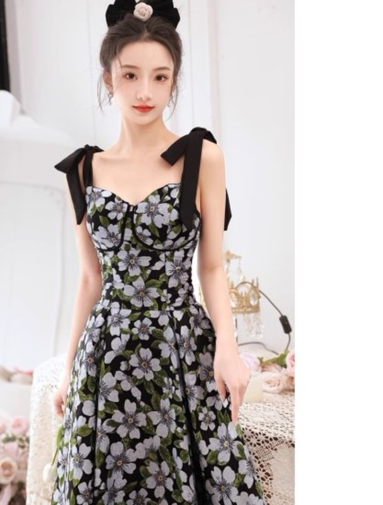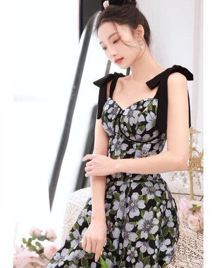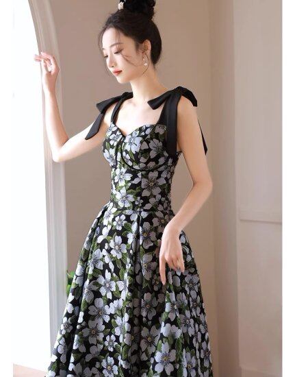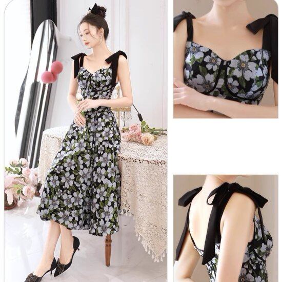 結婚式ドレス レディース 花柄 ノースリーブ Aライン ミモレ丈 肩リボン キャミソール プリントワンピース フラワープリント 二次会 ステージ衣装 パーティードレス イブニングドレス エレガント