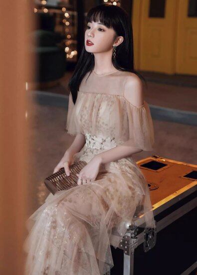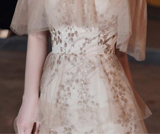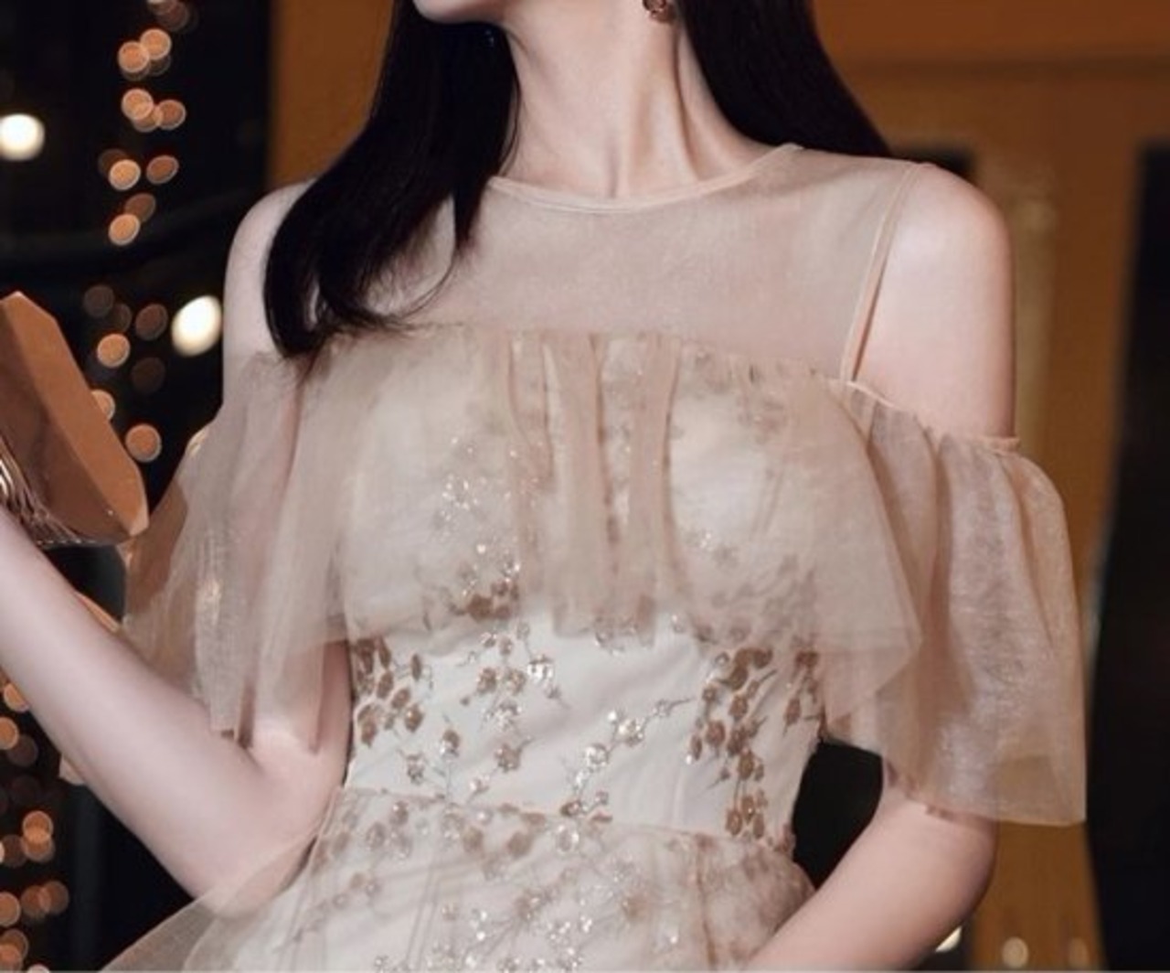 結婚式ドレス レディース オフショルダー レース ティアードワンピース 透け感 シースルー シアー 肩出し 演奏会 二次会 披露宴 ステージ衣装 パーティードレス イブニングドレス エレガント