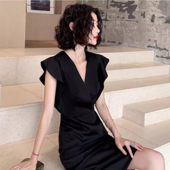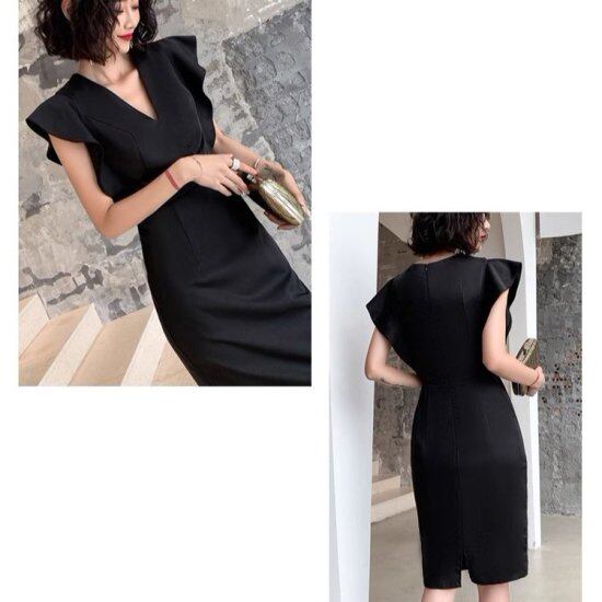結婚式ドレス レディース Vネック フリル ノースリーブ カシュクール タイトワンピース 黒 ブラック ひざ丈 シンプル 無地 演奏会 二次会 披露宴 パーティードレス 上品 ワンピース エレガント