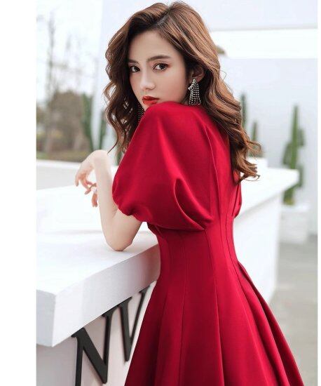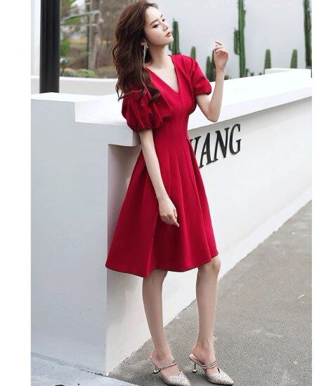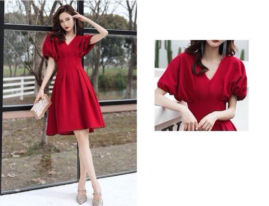 結婚式ドレス レディース Vネック パフスリーブ Aライン ワンピース フレア 半袖 無地 ショート丈 ひざ丈 演奏会 二次会 披露宴 謝恩会 パーティードレス イブニングドレス 華やか エレガント