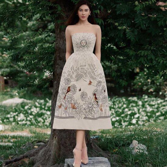 パーティードレス レディース プリントワンピース 個性的 ベアトップ チューブトップ ノースリーブ 花柄 太陽 ボタニカル ハイウエスト ロング丈 ミモレ丈 ワンピース かわいい ワンピース