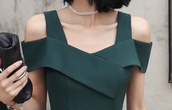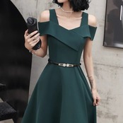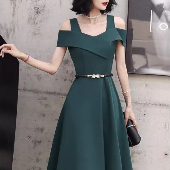 結婚式ドレス レディース オフショルダー フレアワンピース Aライン Vネック ストラップ ミディアム丈 ひざ丈 グリーン 緑 演奏会 二次会 披露宴 パーティー イブニングドレス エレガント