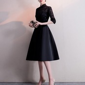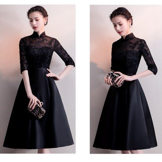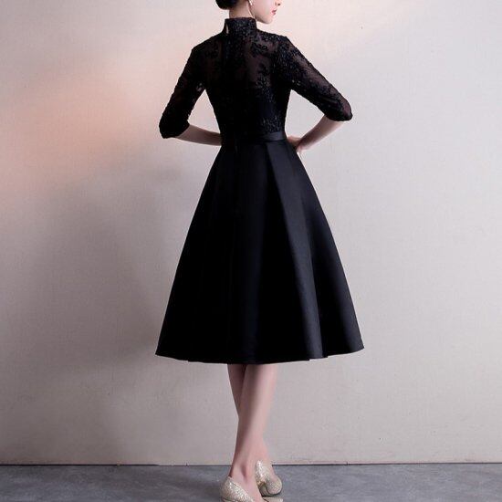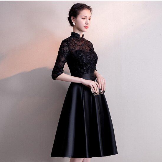 結婚式ドレス レディース チャイナ風 レース 五分袖 スタンドカラー Aラインワンピース ミディアム丈 ひざ丈 透け感 シアー 上品 演奏会 二次会 披露宴 謝恩会 パーティー イブニングドレス