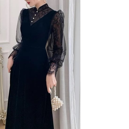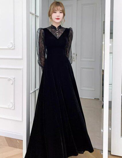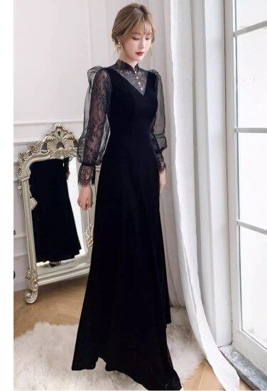 結婚式ドレス レディース レース ベルベット 長袖 Vネック スタンドカラー 透け感 シアースリーブ シースルー ロング丈 マキシ丈 演奏会 二次会 披露宴 謝恩会 パーティードレス エレガント