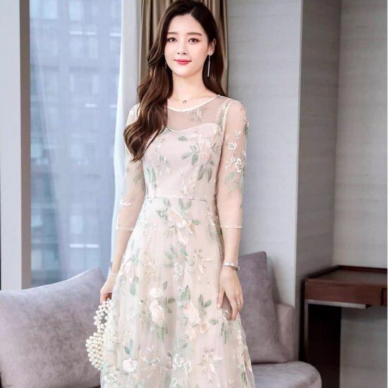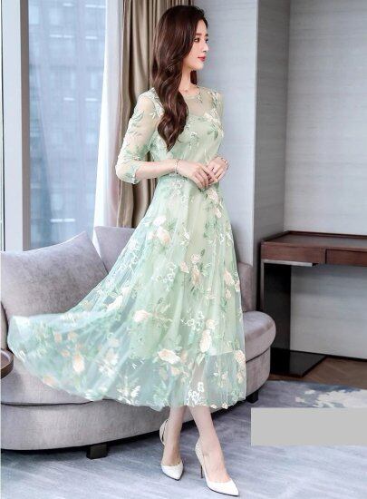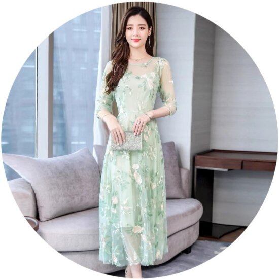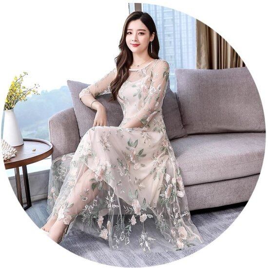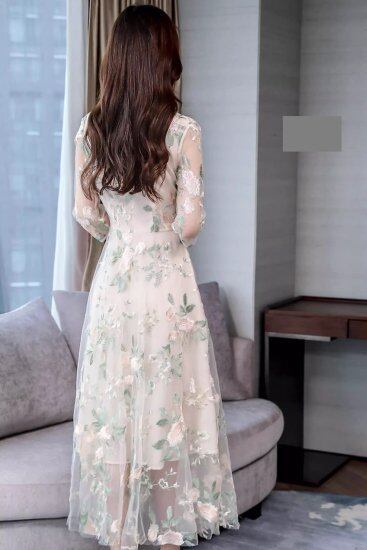結婚式ドレス レディース レースワンピース 花柄 刺繍 七分袖 ラウンドネック 透け感 シースルー シアー ミモレ丈 ロング丈 演奏会 二次会 披露宴 謝恩会 パーティードレス 華やか エレガント