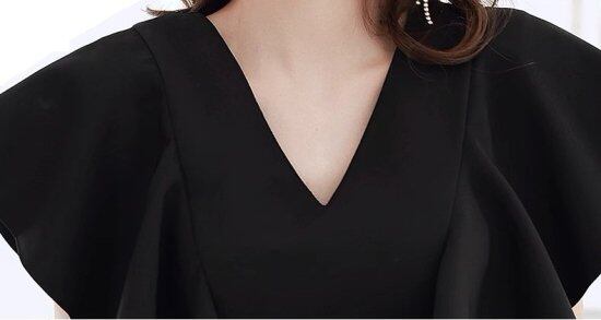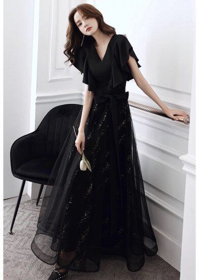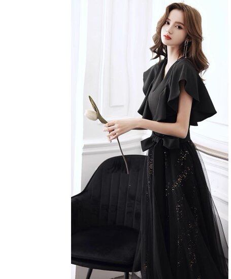 結婚式ドレス レディース フリル Vネック リボン ハイウエスト レース ボリューム袖 フリルスリーブ 透け感 シアー 演奏会 二次会 披露宴 ステージ衣装 パーティー イブニングドレス エレガント