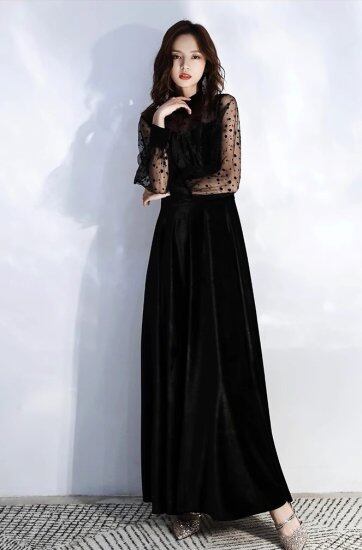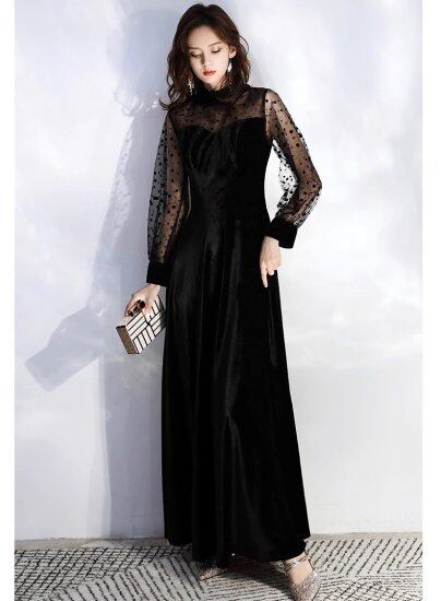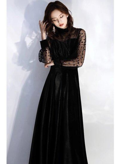 結婚式ドレス レディース ロングドレス ドット柄 水玉 シースルー シアー スタンドカラー 長袖 透け感 ロング丈 マキシ丈 演奏会 二次会 披露宴 パーティー イブニングドレス エレガント