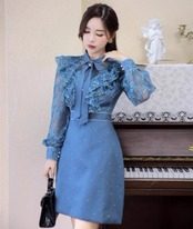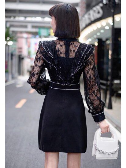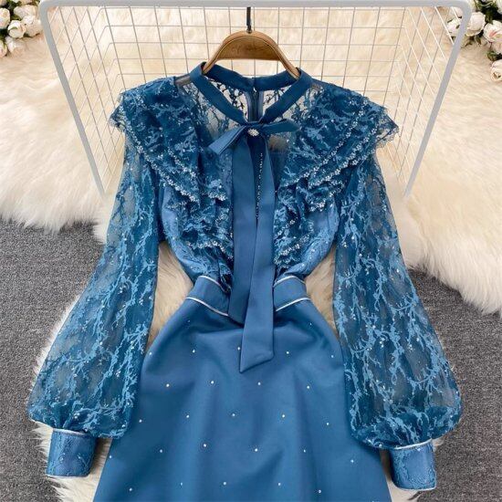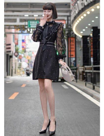 結婚式ドレス レディース ミニドレス レース フリル 長袖 スタンドカラー リボン 透け感 シースルー シアー ショート丈 ミニ丈 ワンピース 演奏会 二次会 披露宴 パーティードレス エレガント
