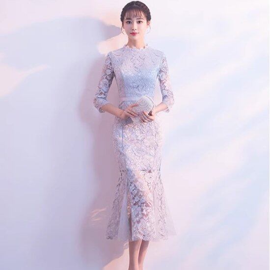 結婚式ドレス レディース マーメイド レースワンピース 刺繍 レース 七分袖 ノーカラー 総レース ミモレ丈 スリム タイト 演奏会 二次会 披露宴 謝恩会 パーティー イブニングドレス エレガント