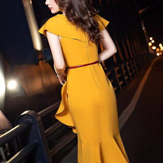 結婚式ドレス レディース Vネック フリル アシンメトリー フィッシュテール マーメイド ノースリーブ ワンピース ベルト 演奏会 二次会 披露宴 謝恩会 パーティー イブニングドレス エレガント