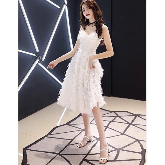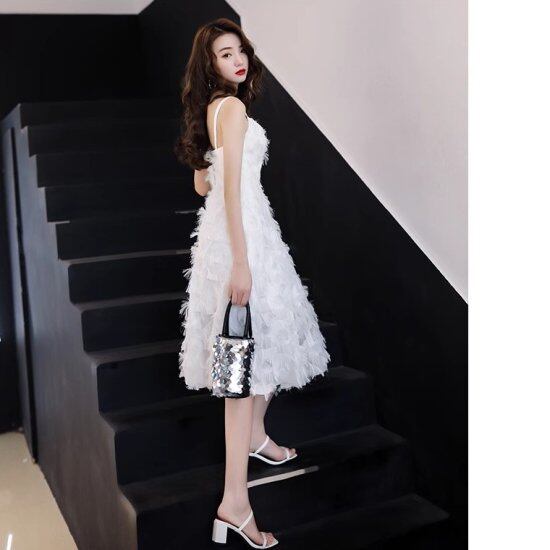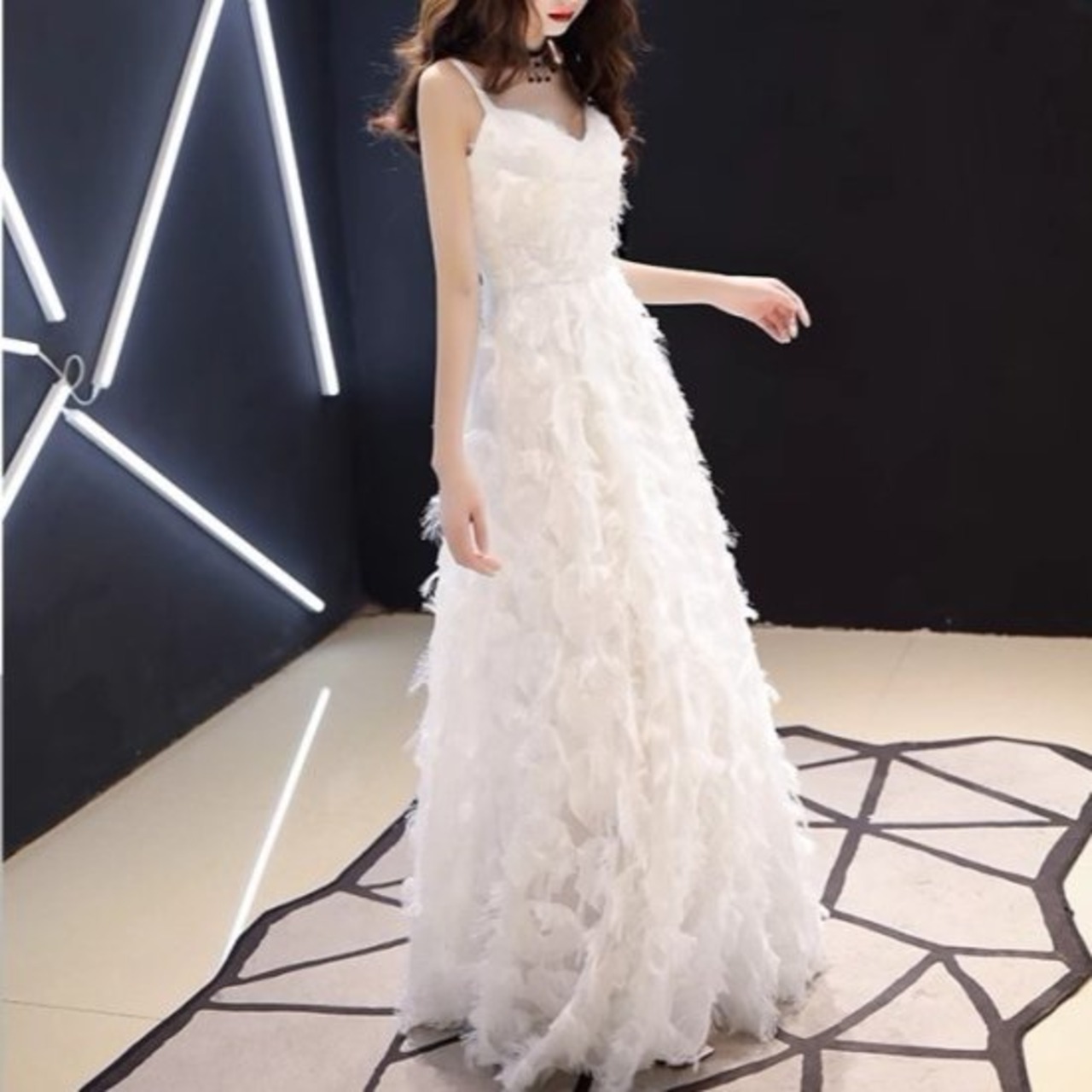 ふわふわなフェザーがあしらわれたエレガントなドレス。