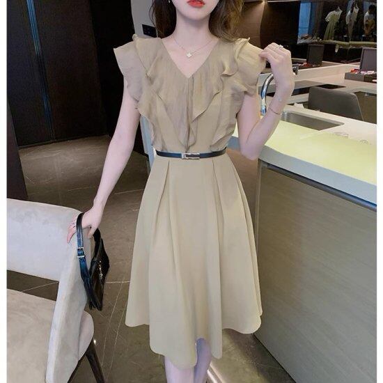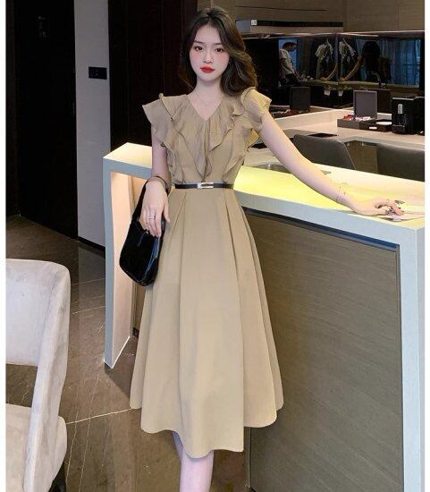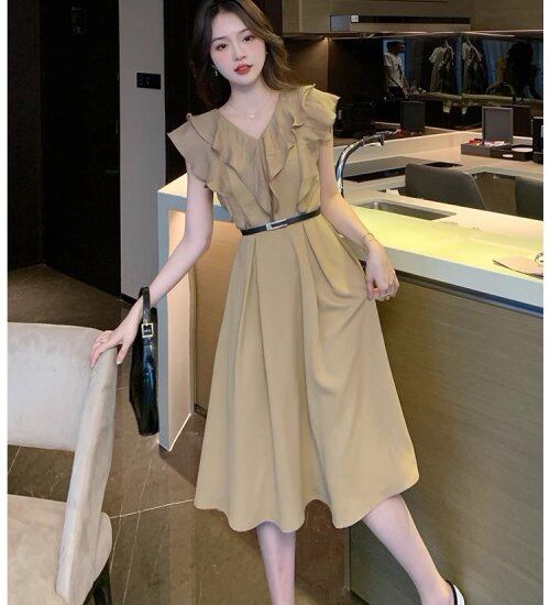 結婚式ドレス レディース フリル Vネック ノースリーブ フレンチスリーブ Aラインワンピース ミディアム丈 ミモレ丈 フレア 演奏会 二次会 披露宴 謝恩会 パーティードレス エレガント おしゃれ