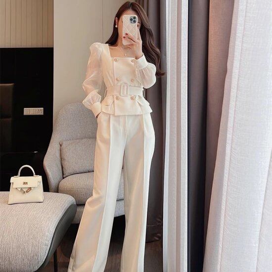 金ボタンがレトロな雰囲気のパンツスーツ。