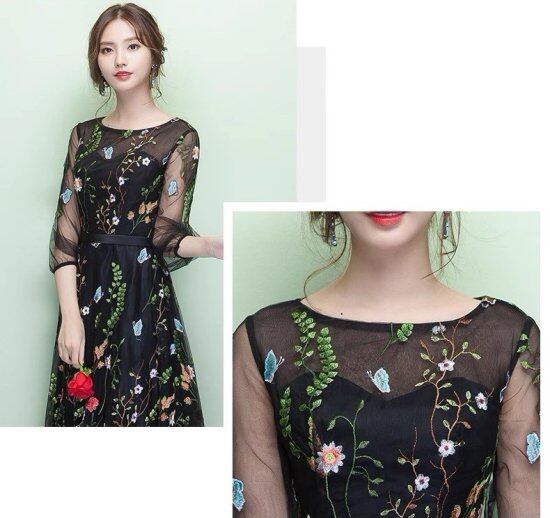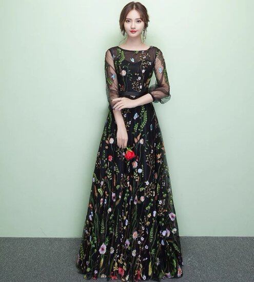 結婚式ドレス レディース 花柄 ロングドレス レース 刺繍 透け感 シアースリーブ 七分袖 ボタニカル マキシ丈 演奏会 二次会 披露宴 ステージ衣装 謝恩会 パーティードレス 華やか エレガント