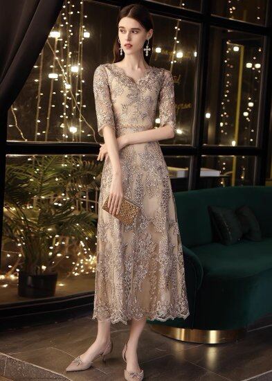 結婚式ドレス レディース Vネック レースワンピース 刺繍 五分袖 七分袖 透け感 シアー レーススリーブ ビーズ ビジュー 演奏会 二次会 披露宴 パーティー イブニングドレス 華やか エレガント
