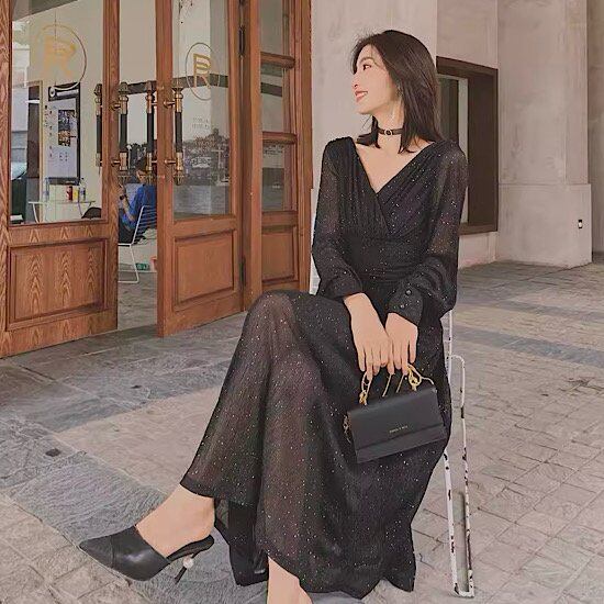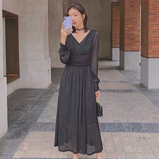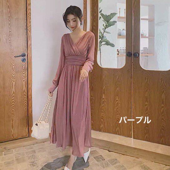 結婚式ドレス Vネック 無地 シンプル 長袖 ロング丈 ハイウエスト 発表会 演奏会 レディース 結婚式 ステージ衣装 エレガント ウエディングドレス カラードレス イブニングドレス フレンチ