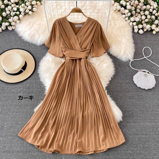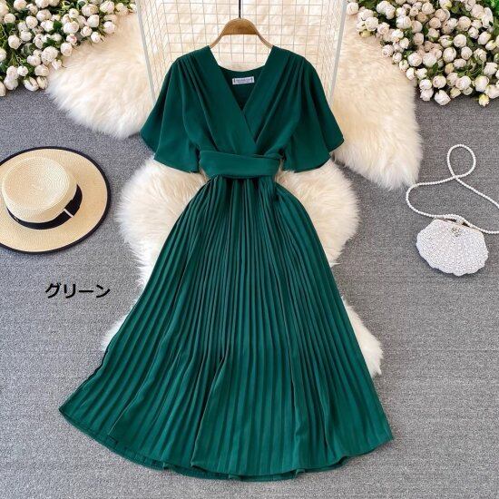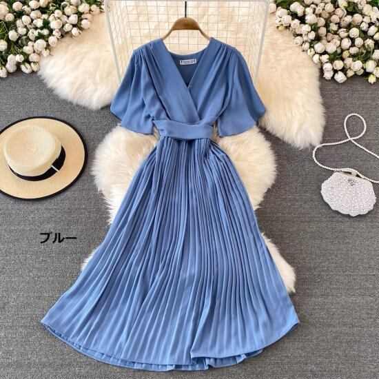 結婚式ドレス レディース プリーツワンピース Vネック カシュクール ハイウエスト プリーツスカート 半袖 Aライン 演奏会 二次会 披露宴 謝恩会 カラードレス パーティー 華やか エレガント