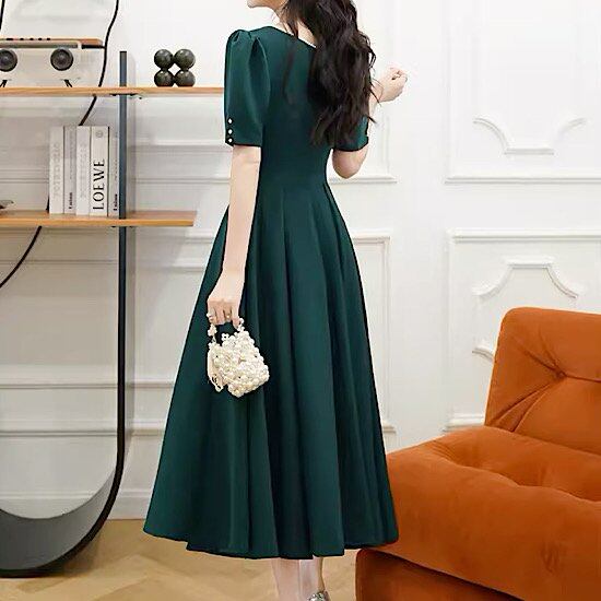 結婚式ドレス スクエアネック ビジュー シンプル 半袖 ミモレ丈 ハイウエスト 発表会 演奏会 レディース 結婚式 ステージ衣装 エレガント ウエディングドレス カラードレス イブニングドレス