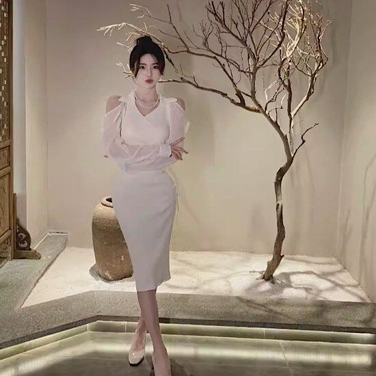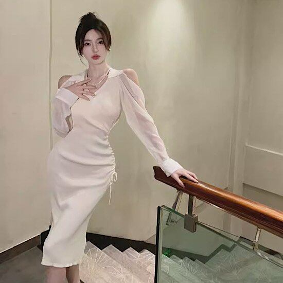 結婚式ドレス 肩出し シースルー 長袖 スリムフィット シンプル 長袖 ミモレ丈 発表会 演奏会 レディース 結婚式 ステージ衣装 エレガント ウエディングドレス カラードレス イブニングドレス