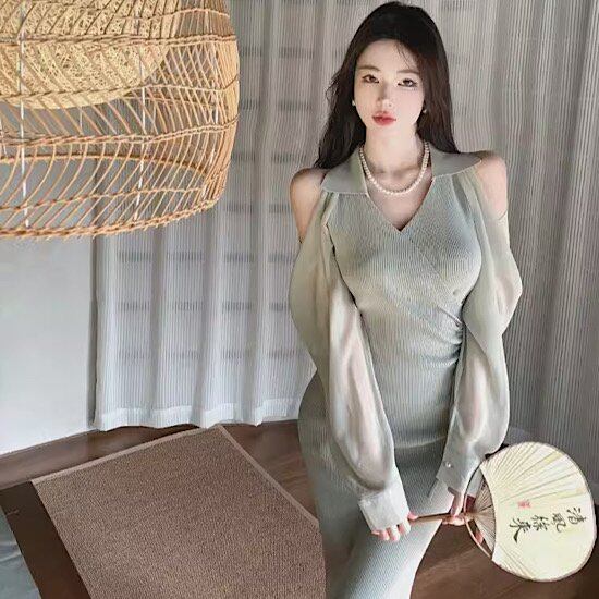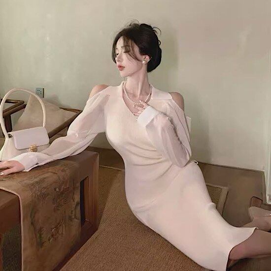 お洒落なシースルーとすっきり感のあるVネックがクールなミディアムワンピースドレス。