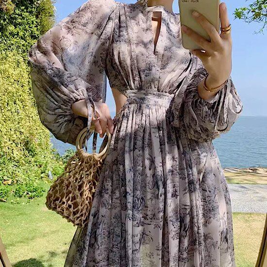 シフォン素材で重たい印象にはならずアクセサリーなどとの相性がとてもいいロングワンピースドレス。
