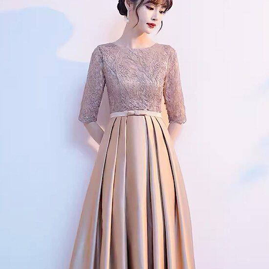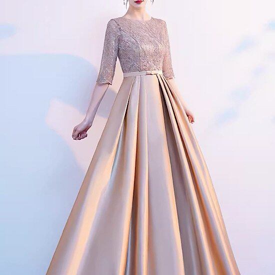 結婚式ドレス ラウンドネック 五分袖 ウエストマーク ロング丈 ハイウエスト 発表会 演奏会 レディース 結婚式 ステージ衣装 エレガント ウエディングドレス カラードレス イブニングドレス