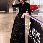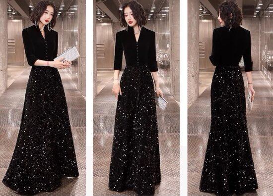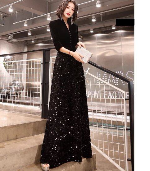 演奏会ドレス レディース 結婚式ドレス Vネック ロングドレス スパンコール ビーズ 異素材MIX Aライン マキシ丈 シック モード きれいめ エレガント パーティー イブニングドレス おしゃれ