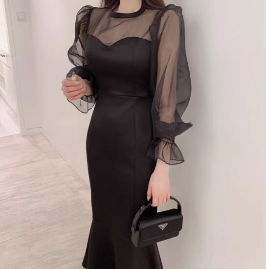 パーティードレス レディース ワンピースドレス 結婚式ドレス 演奏会ドレス シースルー フィッシュテール ボリューム袖 パフスリーブ ハイウエスト きれいめ エレガント お呼ばれ フォーマル ドレス